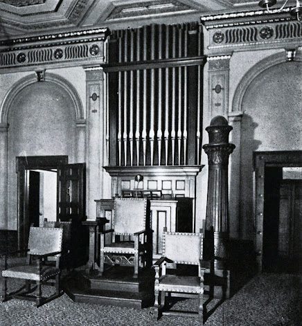 Each Lodge Room could accommodate 200 and contained its own two manual Moller pipe organ and a mezzanine floor for robing. The Blackstone Room's Moller is shown here.