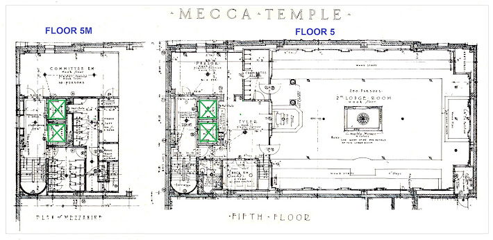 Below, a plan of the backstage and West Fifty-sixth Street entries. Besides the two office building elevators, a third car serviced the dressing rooms exclusively (in green). "There are two complete sets of dressing rooms," wrote the Richmond Times-Dispatch, "one for the accommodation of theatrical companies and another for the uses of Temple nobles, members, divans, patrols, etc." From The Meccan: "The special rooms planned for the [Shrine] units, our storage and property rooms, are an integral part of the theatre proper, and yet they can be shut off when the theatre is devoted to outside enterprises, and our property will be safe from the transfer men moving a show in or out."6